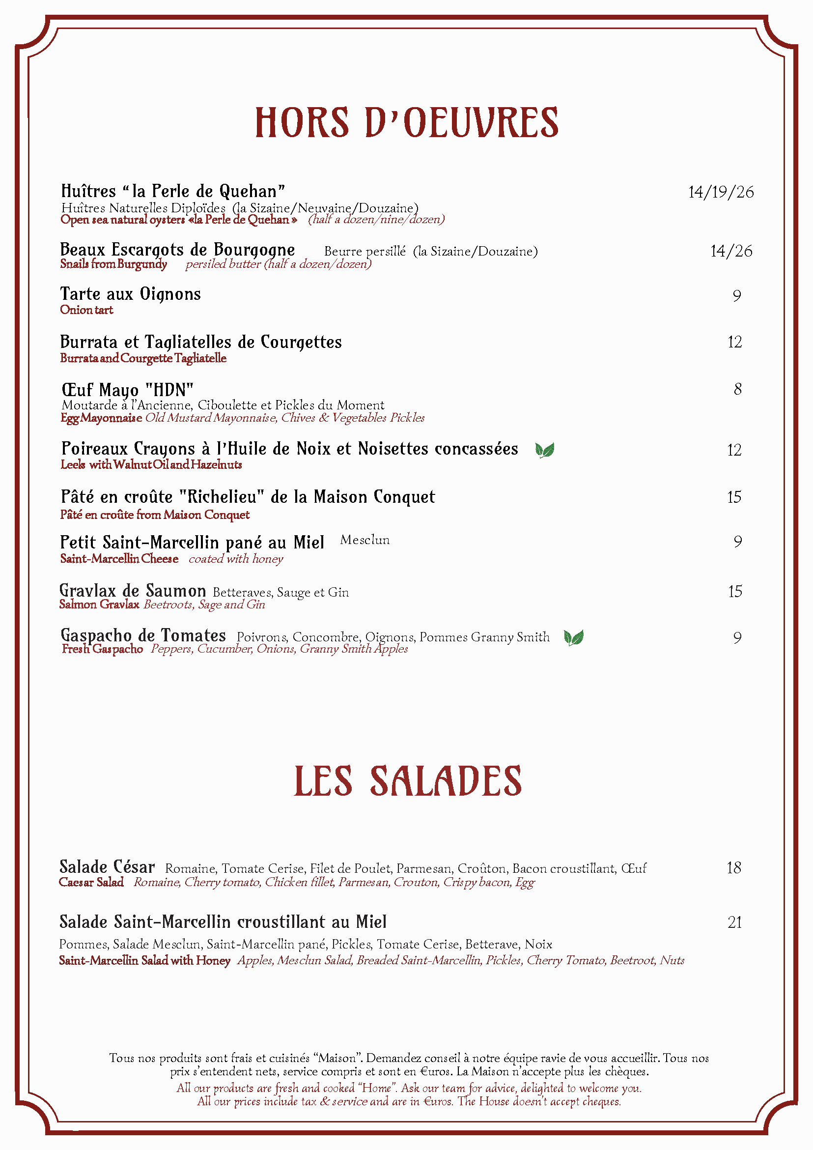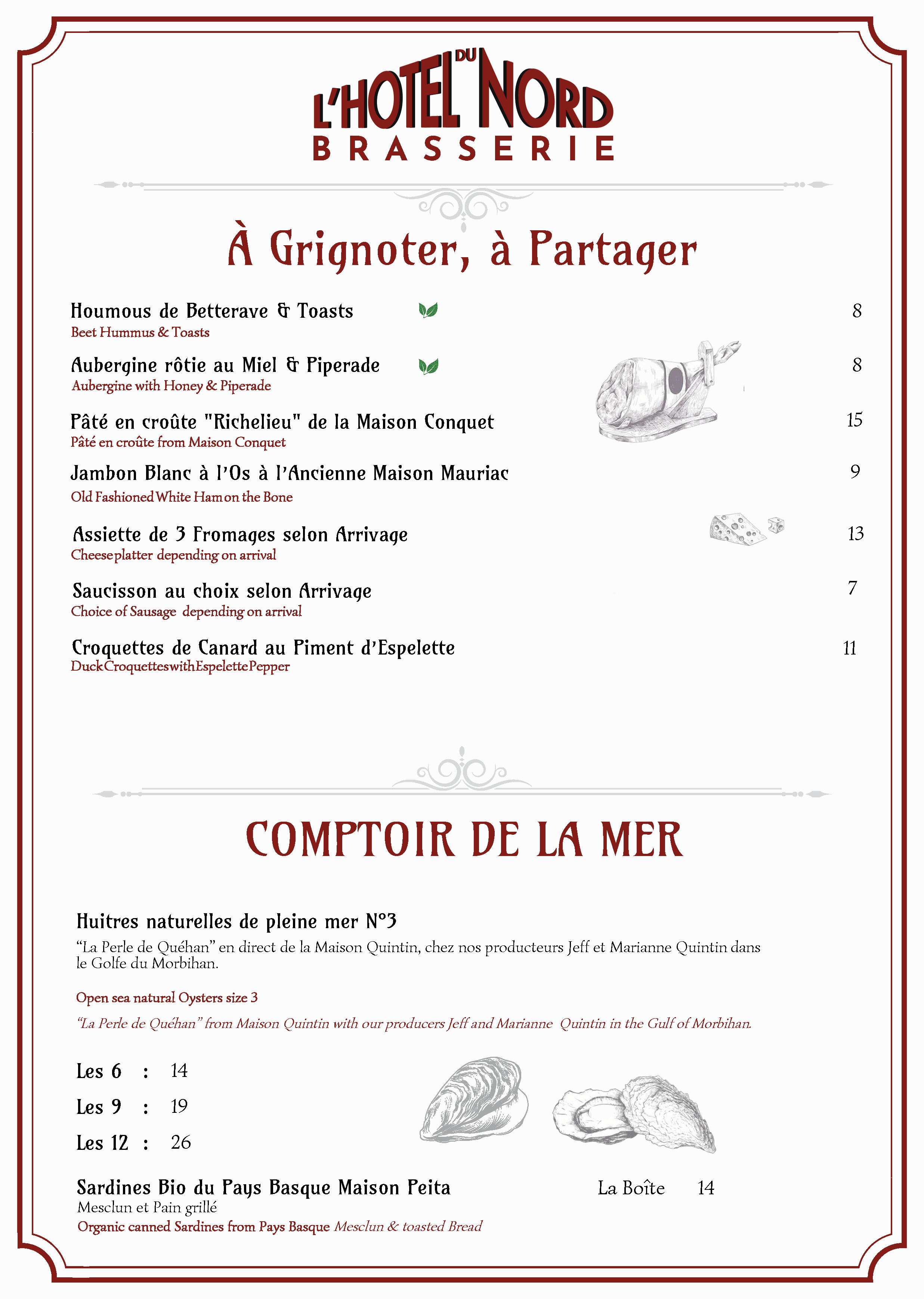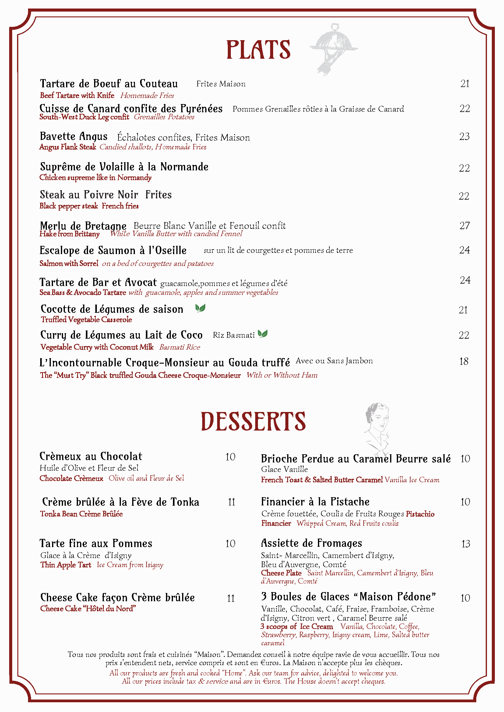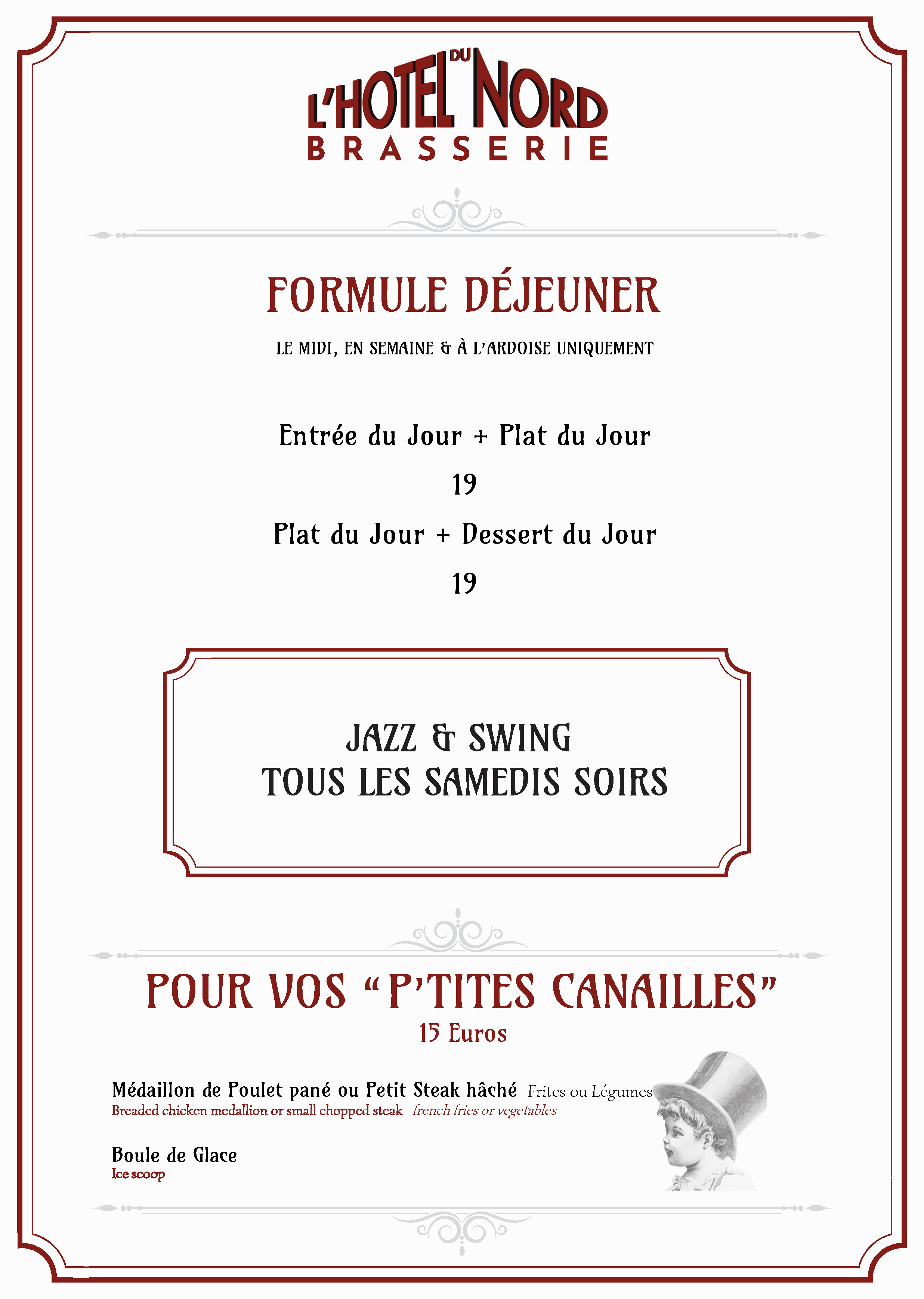 À la carte Liste des allergènes Menu de l'été La carte des vins VOIR LA CARTE La carte des Cocktails VOIR LA CARTE